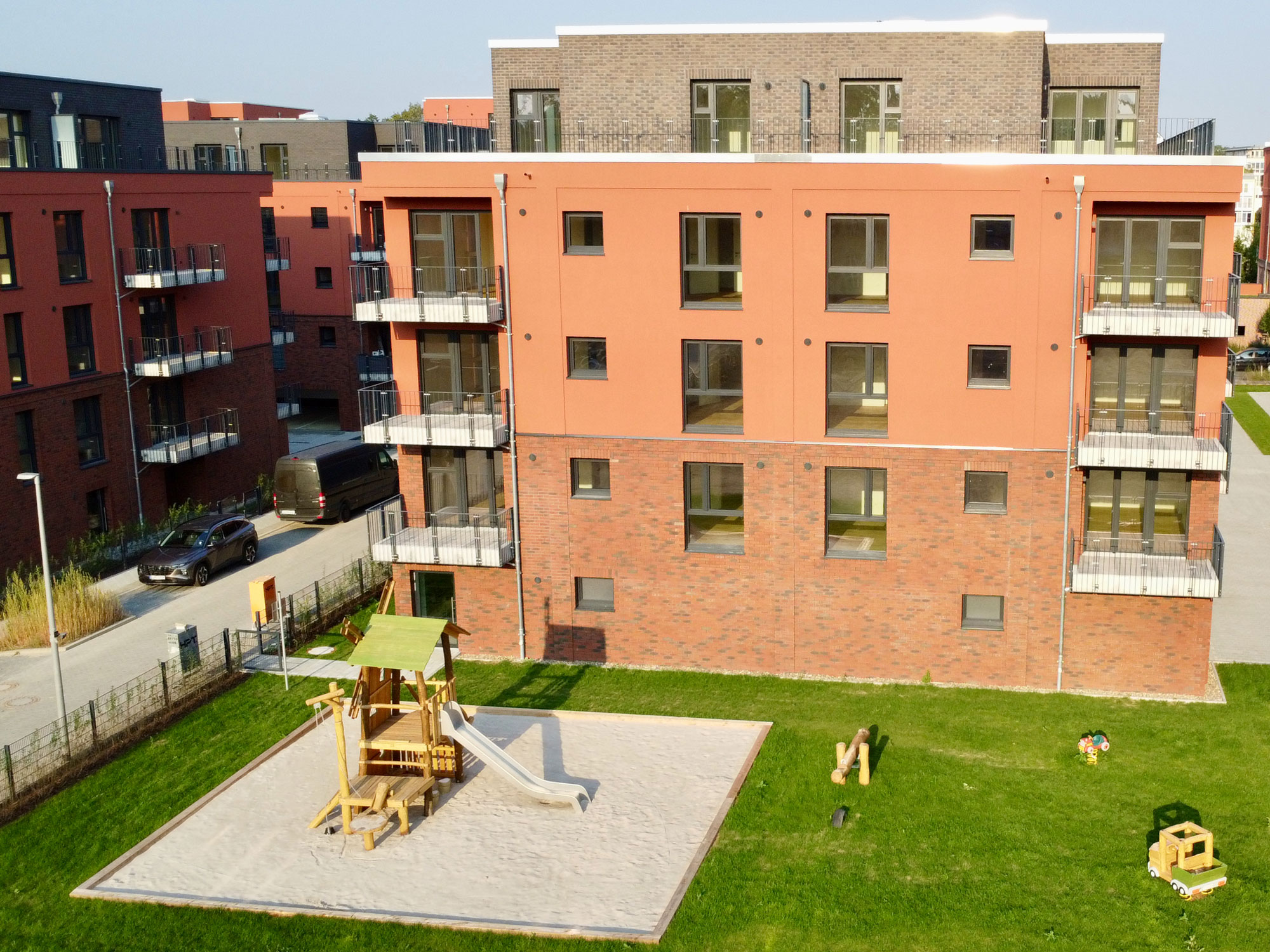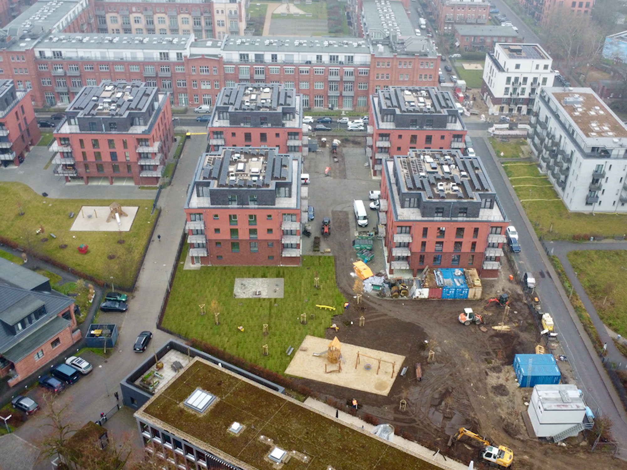 Neubau eines Wohn-Quartiers auf einem Grundstück von 25000 m² bestehend aus 25 Mehrfamilienhäusern, sechs Reihenhäusern und einer Kita mit ca. 480 Wohnungen